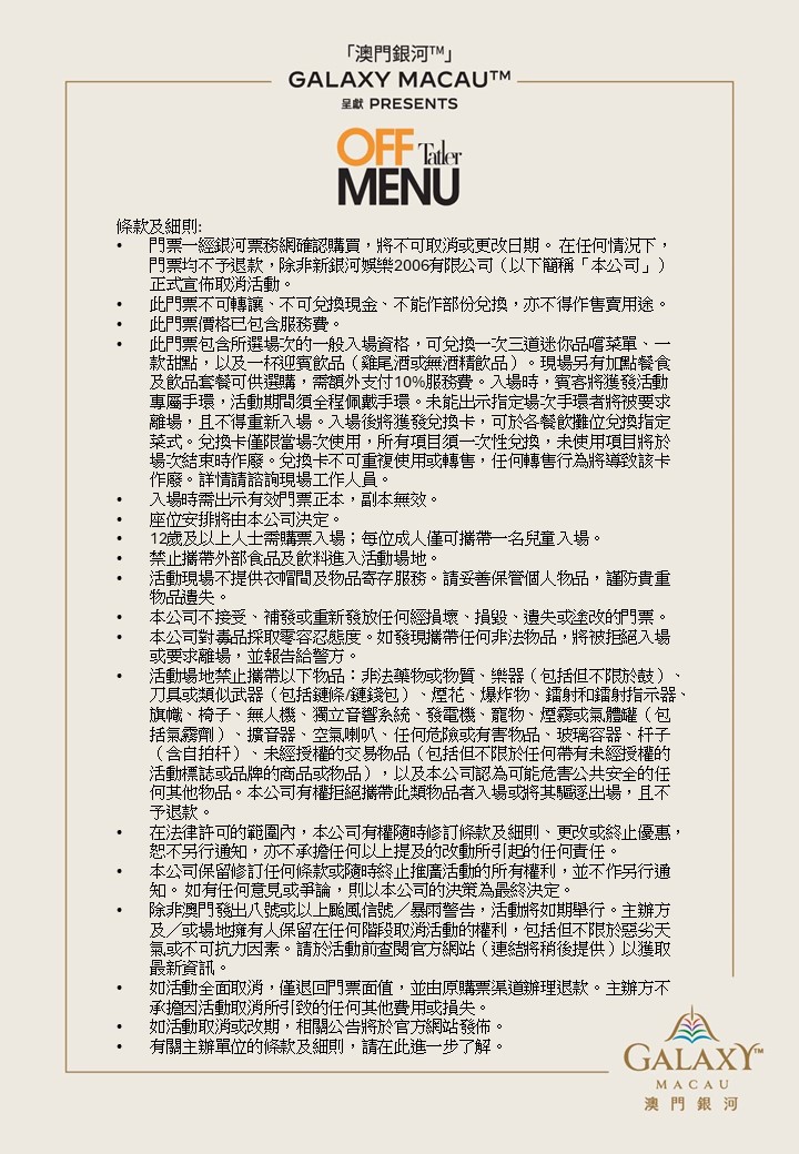 活動: | 「澳門銀河」呈獻Tatler Off Menu | |