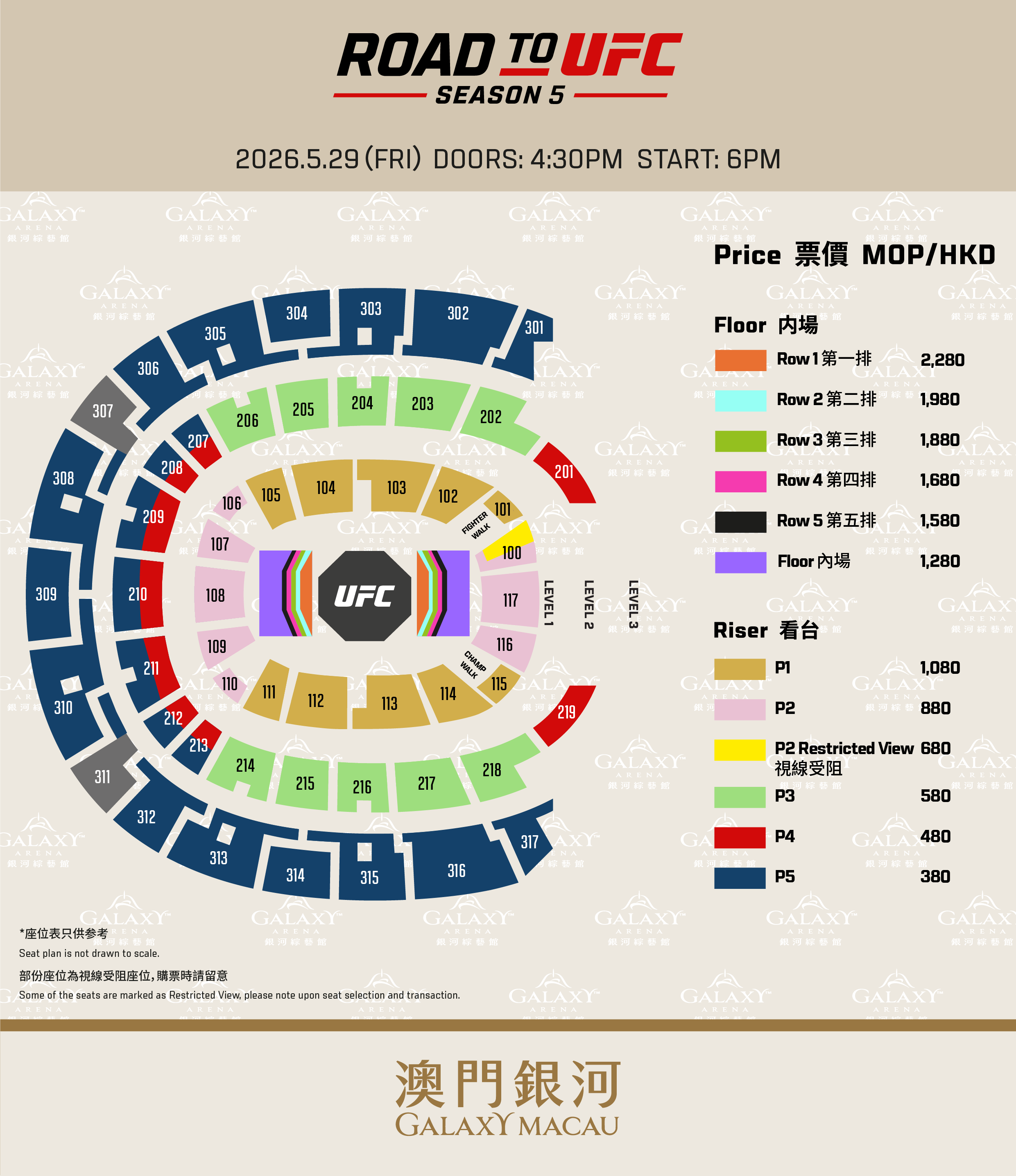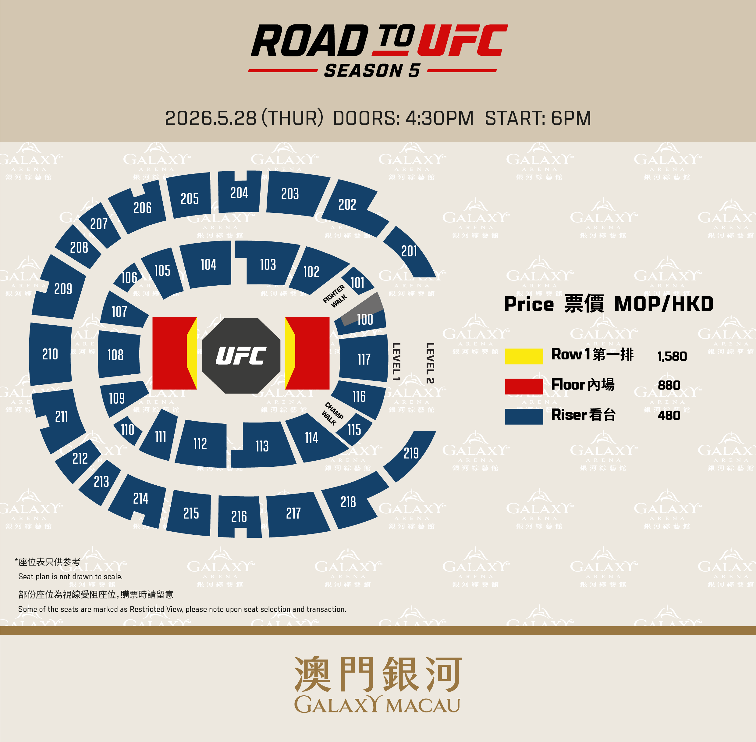 座位表: | UFC格鬥之夜澳門 (5月30日 周六)座位表 UFC精英之路第五季首輪第一日(5月28日 周四) 座位表 UFC精英之路第五季首輪第二日(5月29日 周五) 座位表 |