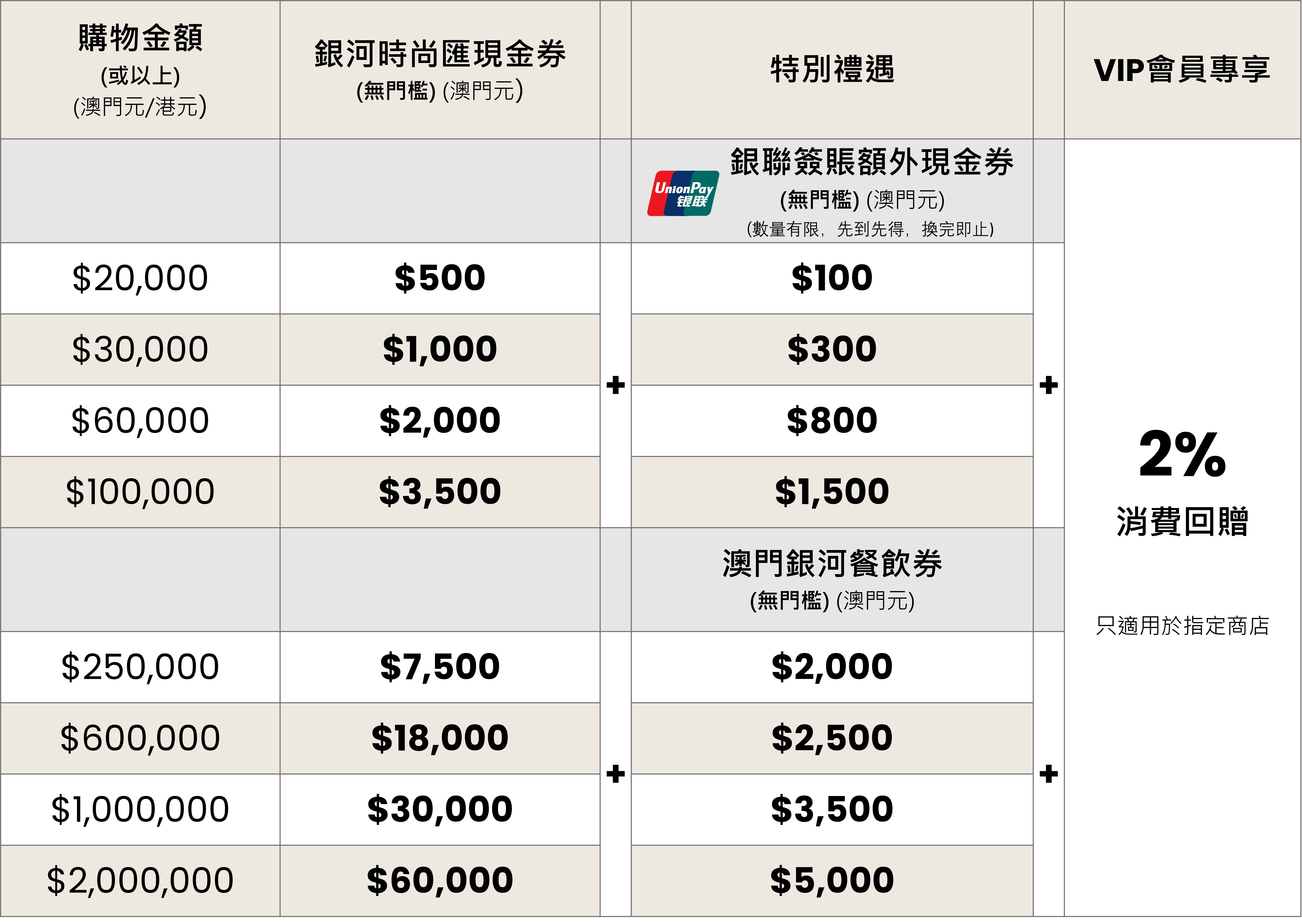 踏入節日季,盡享奢華品牌新品及專屬佳節購物禮遇!2025年12月18至2026年1月4日,於銀河時尚匯購物滿$20,000可享高達7%購物及餐飲返現,包括銀聯用戶的專屬現金券— 為摯愛挑選完美禮物,也別忘寵愛自己!
