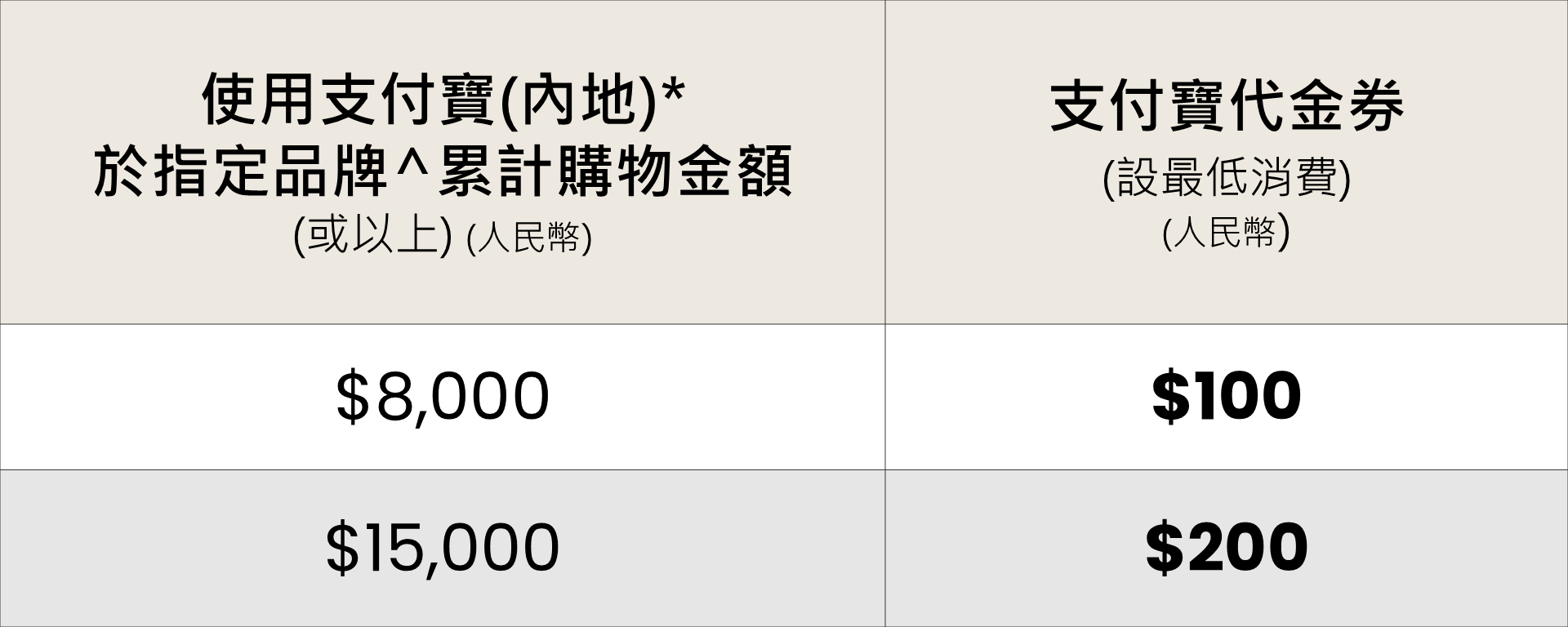 禮遇1: 使用支付寶(內地)*於指定品牌^購物享支付寶代金券