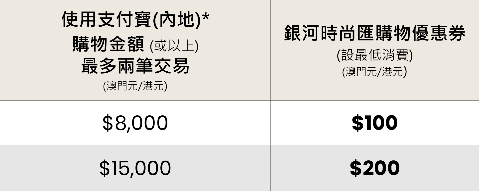 禮遇2: 使用支付寶(內地)*購物享銀河時尚匯購物優惠券